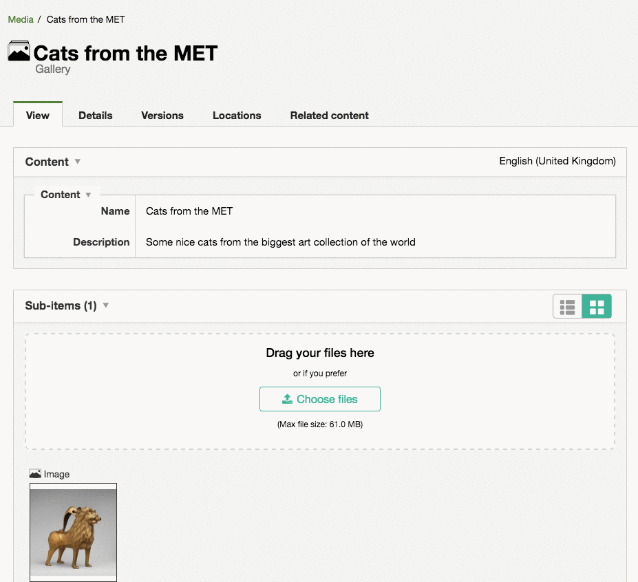 You can now create collections of content quickly: upload multiple files in bulk and they're imported directly into the content repository. The files are automatically imported as content using the content type that matches their MIME type. Go to the content view, drag and drop or select multiple files in the sub-items area and you get direct access for further editing. As ever, this solution can be customized so that you create your own matching rules.